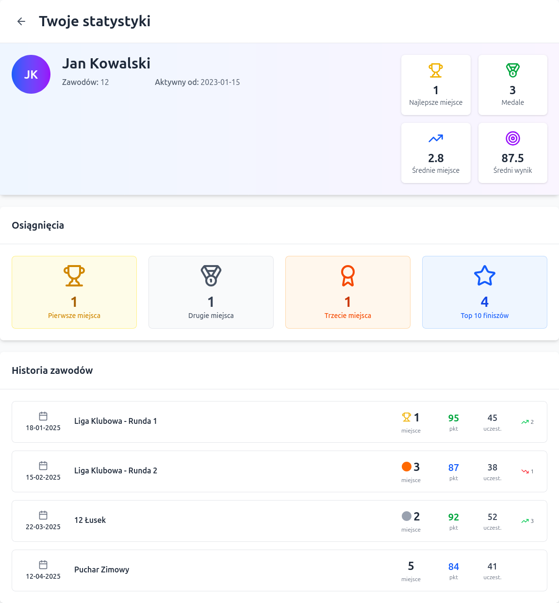 • Twoje osobiste archiwum: Przeglądaj historię wszystkich swoich startów. Analizuj wyniki z poprzednich zawodów, porównuj osiągnięcia i planuj kolejne wyzwania.
